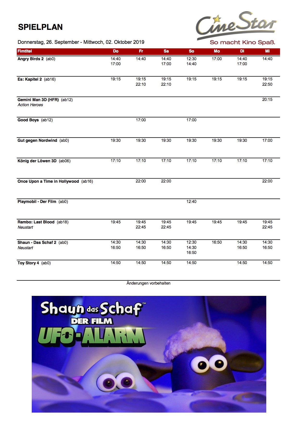 Der ab heute gültige Spielplan für das CineStar in Waren mit folgenden Neustarts: