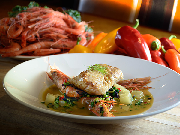 Variation von Fisch & Meeresfrüchten auf Salatbett mit Weißbrot