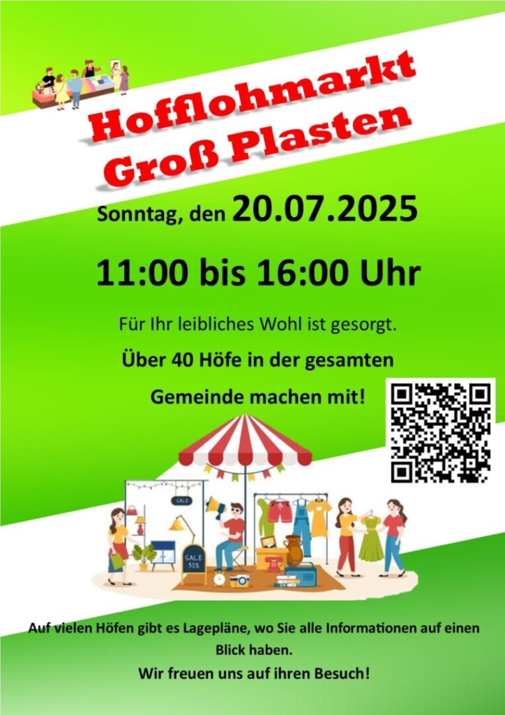 WeiterlesenDa gibt es sicher ganz viel zu entdecken: Die Gemeinde Groß Plasten lädt am Sonntag, 20. Juli, wieder zum großen Hofflohmarkt ein. Mehr als 40 Höfe der Gemeinde machen mit: