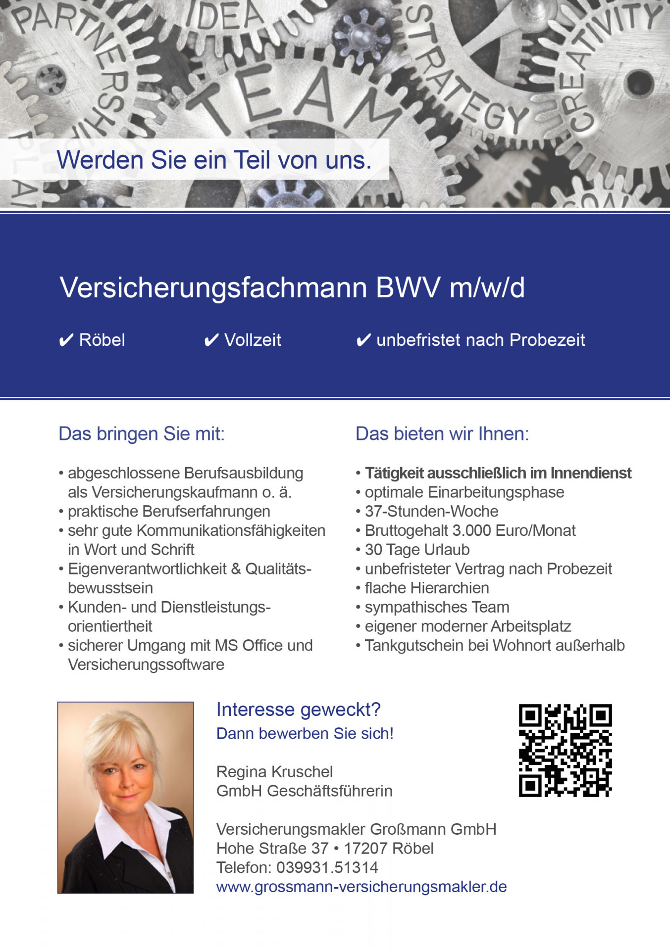 Die Versicherungsmakler Großmann GmbH in Röbel ist auf der Suche nach einem Versicherungsfachmann.
