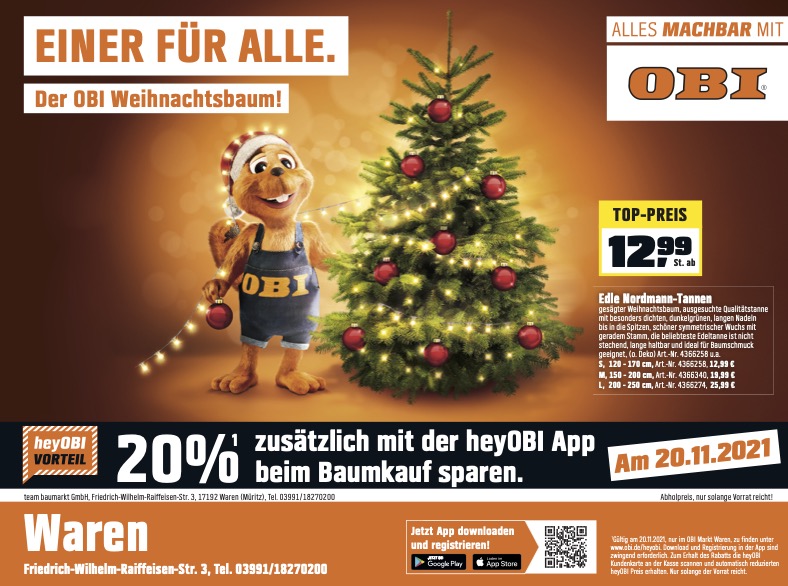 Am kommenden Sonnabend, 20. November, lohnt sich der Kauf des Baumes noch mehr, denn wer die “heyOBI”App herunter lädt, bekommt einen Rabatt von 20 Prozent.