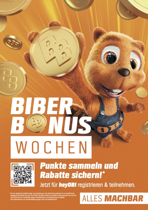 Noch bis zum 3. Juli können Kunden bei OBI haufenweise Biber Bonus Punkte sammeln – und tolle Prämien abräumen.