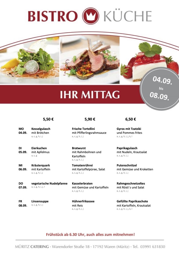 Mit Kesselgulasch, frischen Tortellini in Pfifferlingsrahmsauce sowie Gyros mit Tzatziki startet die Bistro-Küche von Müritz Catering im Warener ÜAZ in die neue Woche.