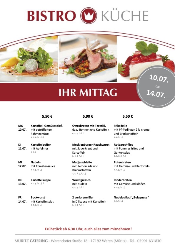 Neue Woche –neuer Speiseplan: In der Bistro-Küche von Müritz Catering im ÜAZ gibt’s heute Kartoffel-Gemüsespieße, Gyrosbraten sowie Frikadelle mit Pfifferlingen.