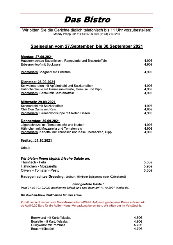 Und hier der komplette Speiseplan für diese Woche sowie der Hinweis, dass das Team von Mandy Propp ab Freitag eine Woche lang in den wohlverdienten Urlaub geht: