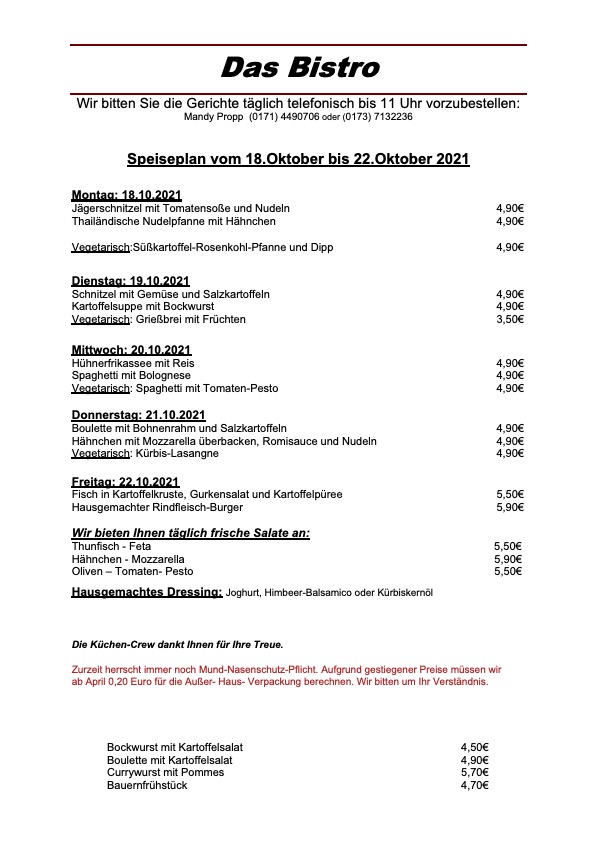 Die neue Woche beginnt in „Das Bistro“ am Warener Amtsbrink mit Jägerschnitzel, Thailändischer Nudelpfanne sowie Süßkartoffel-Rosenkohl-Pfanne. Und hier der komplette Speiseplan für diese Woche: