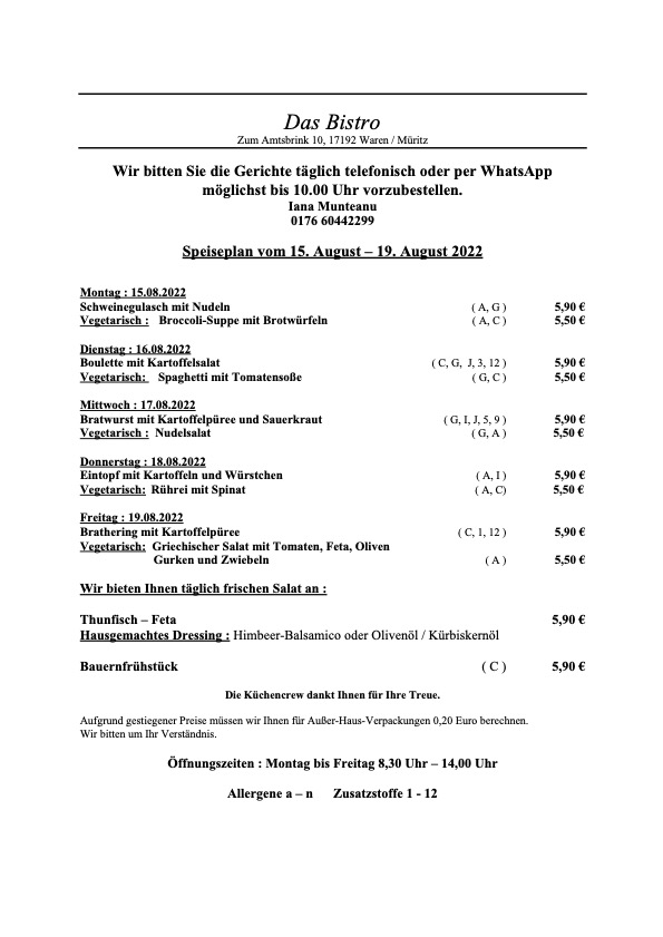 Schulanfang und für viele auch der erste Tag nach dem Urlaub. Ein Glück muss man sich wenigstens nicht ums Mittag kümmern, denn das gibt’s wie gewohnt in „Das Bistro“ am Warener Amtsbrink.