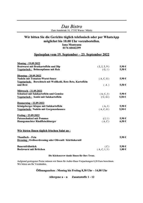 Bratwurst mit Bratkartoffeln sowie eine Bohnenpfanne mit Reis stehen heute auf dem Speiseplan von „Das Bistro“ im Warener Amtsbrink.