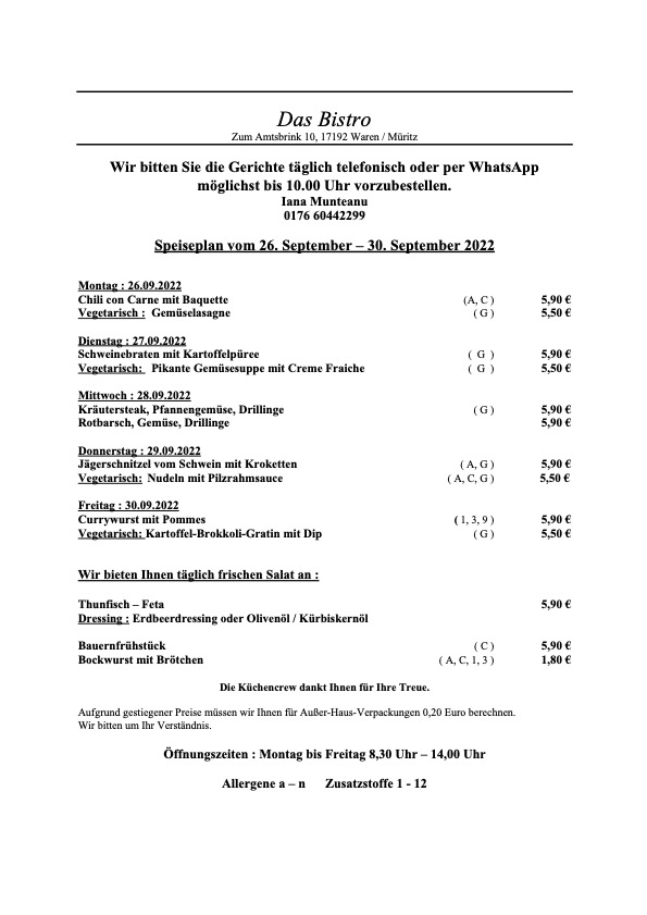 Und hier der komplette Speiseplan für diese Woche: