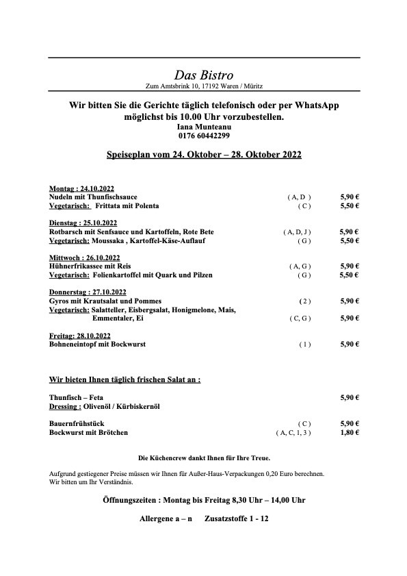 Die Woche beginnt in „Das Bistro“ am Warener Amtsbrink mit Nudeln und Thunfischsoße sowie Frittata mit Polenta.