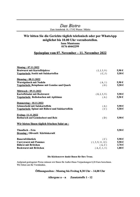 Mit Bratwurst sowie Senfei startet „Das Bistro“ in Waren in die neue Woche.