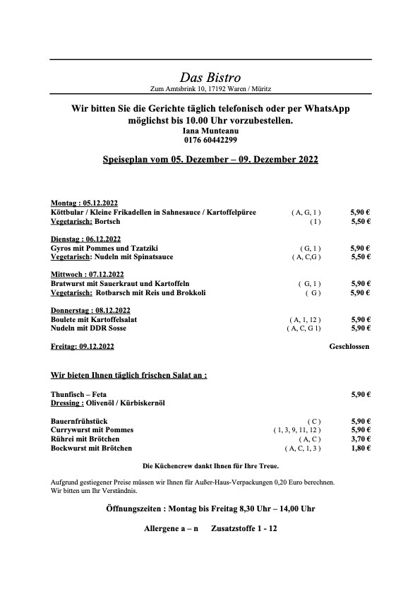 Kleine Frikadellen in Sahnesauce sowie Bortsch stehen heute auf dem Speiseplan von „Das Bistro am Warener Amtsbrink“.