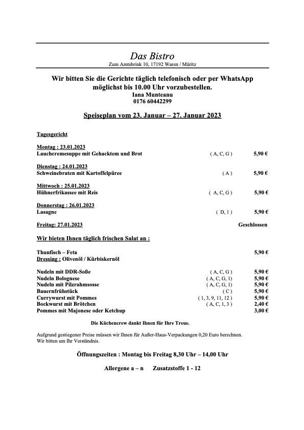 Mit Lauchcremesuppe startet „Das Bistro“ am Warener Amtsbrink in die neue Woche.