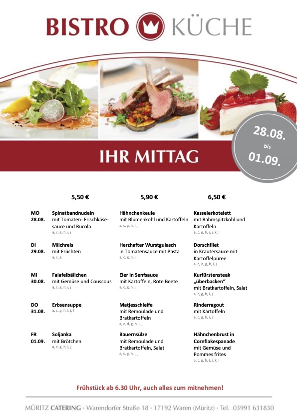 Spinatbandnudeln, Hähnchenkeule sowie Kasslerkotelett stehen heute in der Bistro-Küche von Müritz-Catering im Warener ÜAZ zur Auswahl.