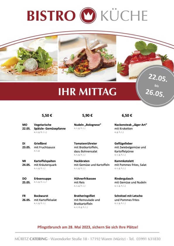 Die Vor-Pfingstwoche beginnt in der Bistro-Küche von Müritz Catering im Warener ÜAZ mit Vegetarischer Spätzle-Gemüsepfanne, Nudeln Bolognese und Nackensteak „Jäger-Art“.