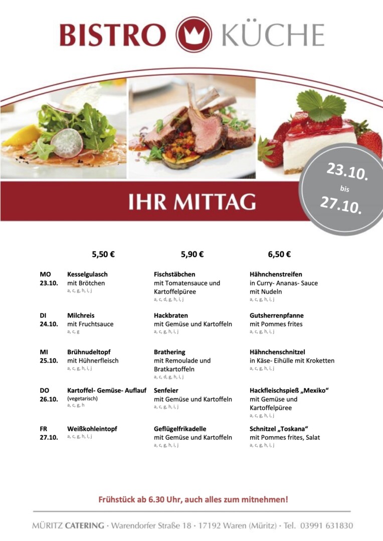 Die letzte Oktoberwoche beginnt in der Bistro-Küche von Müritz Catering im Warener ÜAZ mit Kesselgulasch, Fischstäbchen sowie Hähnchenstreifen in Curry-Ananas-Sauce.