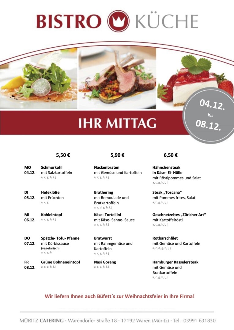 Schmorkohl, Nackenbraten und Hähnchensteak sind heute in der Bistro-Küche von Müritz-Catering im Warener ÜAZ im Angebot.