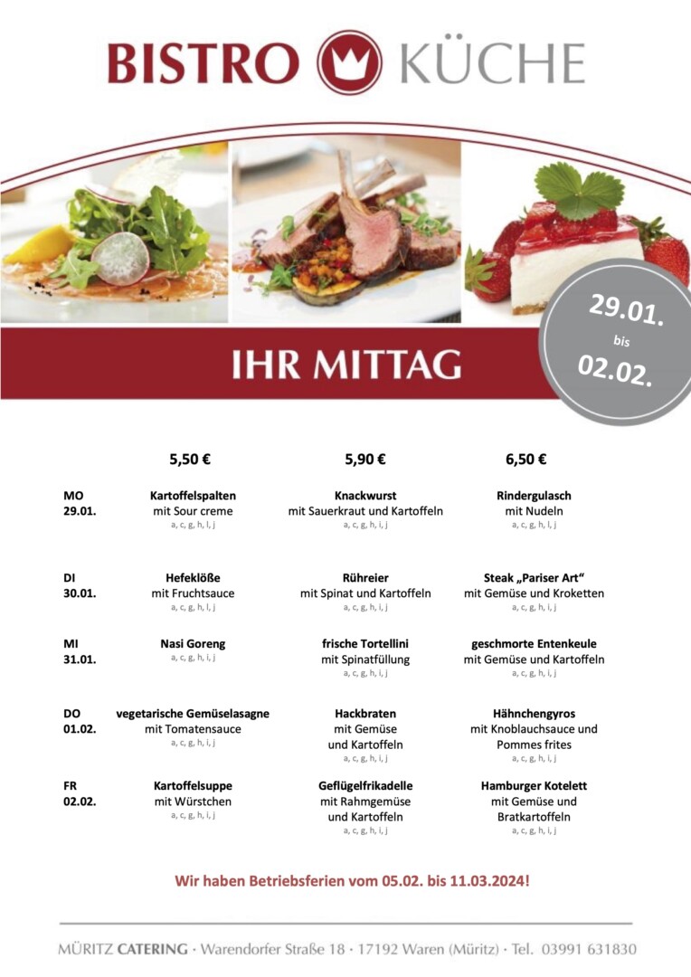 Letzte Woche vor dem Urlaub: Die Bistro-Küche von Müritz Catering im Warener ÜAZ bietet heute Kartoffelspalten, Knackwurst sowie Rindergulasch an.