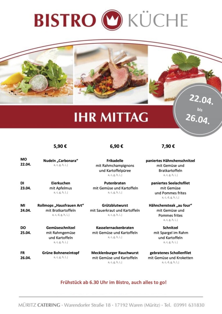 Der Monat geht schon wieder dem Ende entgegen. In der Bistro-Küche von Müritz Catering im Warener ÜAZ startet die neue Woche mit Nudeln „Carbonara“, Frikadelle mit Rahmchampignons sowie paniertem Hähnchenschnitzel.