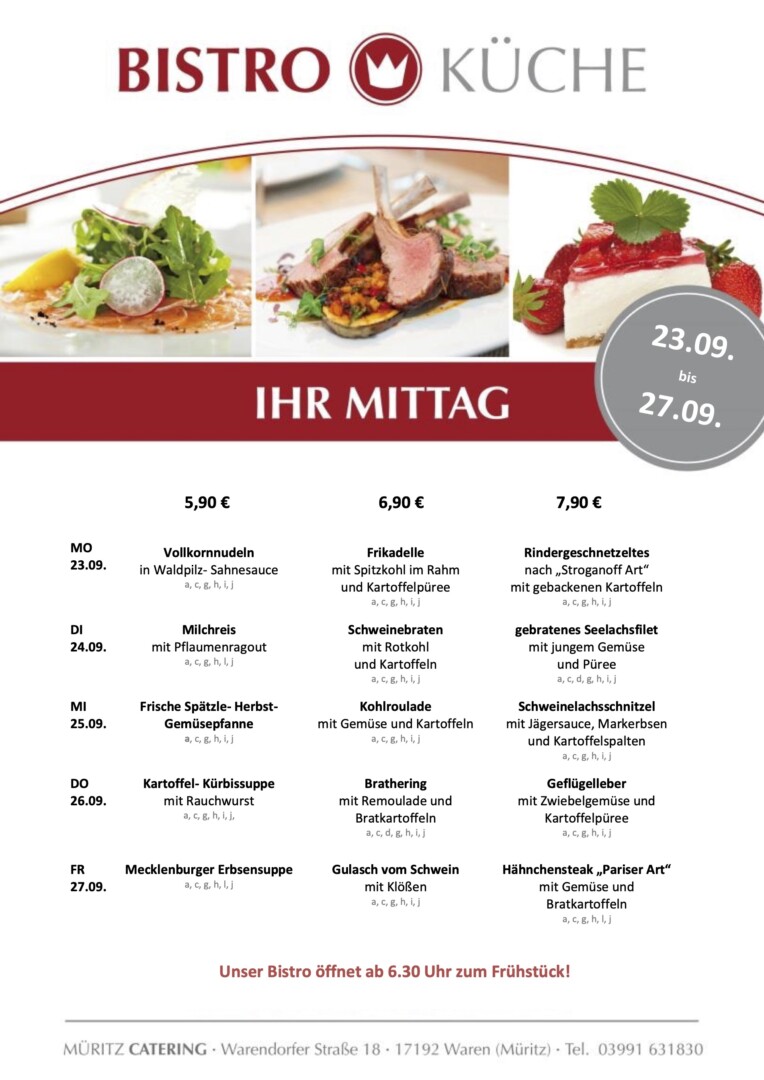 Los geht’s in die letzte September-Woche in der Bistro-Küche von Müritz Catering im Warener ÜAZ mit Volkornnudeln in Waldpilz-Sahnesauce, Frikadelle mit Spitzkohl im Rahm sowie Rindergeschnetzeltem.