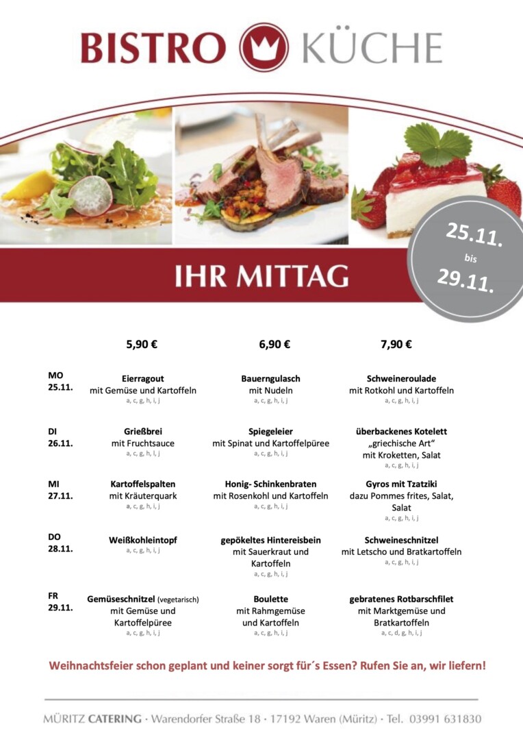 Und schon sind wir in der letzten Novemberwoche. Und die beginnt in der Bistro-Küche von Müritz Catering im Warener ÜAZ mit Eierragout, Bauerngulasch sowie Schweineroulade.