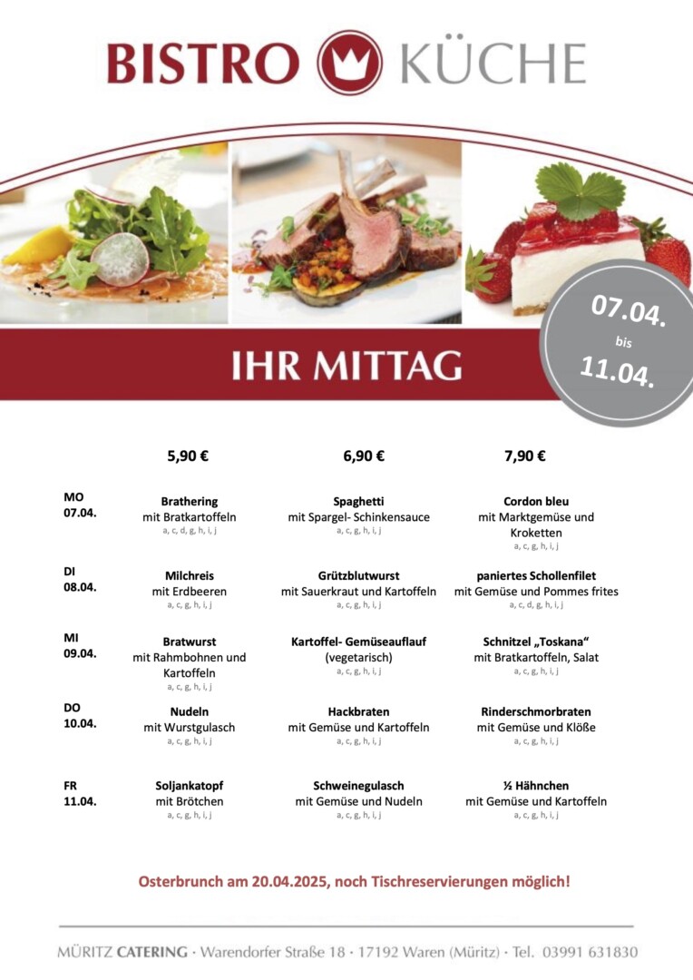 Mit Brathering, Spaghetti und Spargel-Schinkensauce sowie Cordon bleu geht’s in der Bistro-Küche von Müritz Catering im Warener ÜAZ in die neue Woche.