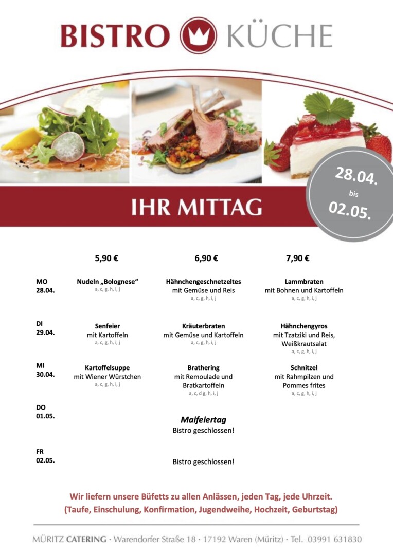 Für viele wird es eine kurze Arbeitswoche, so auch in der Bistro-Küche von Müritz Catering im Warener ÜAZ. Dort geht’s heute mit Nudeln „Bolognese“, Hähnchengeschnetzeltem sowie Lammbraten los.