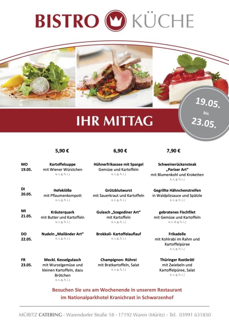 Mit Kartoffelsuppe, Hühnerfrikassee und Spargel sowie Schweinerückensteak „Pariser Art“ startet die Bistro-Küche von Müritz Catering im Warener ÜAZ in die neue Woche.