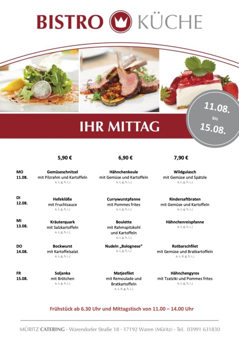 Mit Gemüseschnitzel, Hähnchenkeule sowie Wildgulasch startet die Bistro-Küche von Müritz Catering im Warener ÜAZ in die neue Woche.