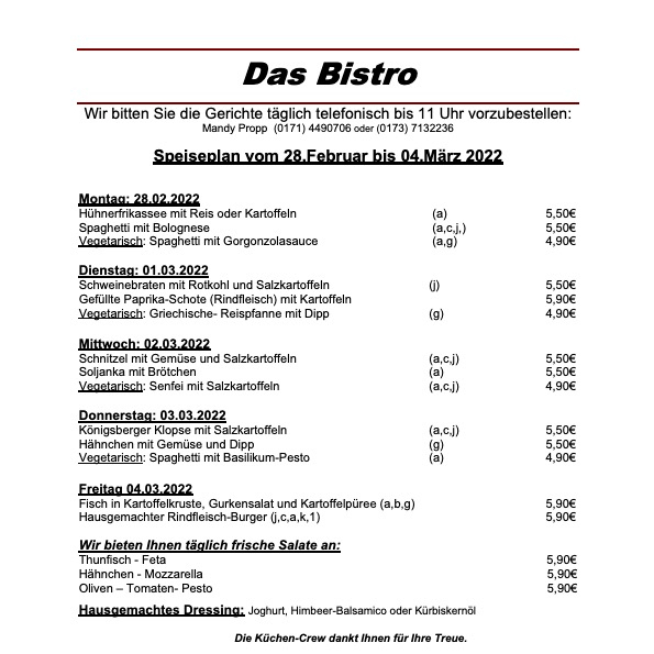 ᵂᴱᴿᴮᵁᴺᴳ | Der Speiseplan für „Das Bistro“ am Warener Amtsbrink