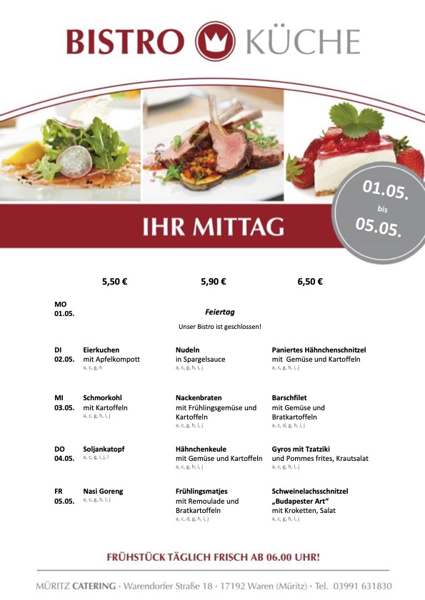 Die verkürzte Woche beginnt in der Bistro-Küche von Müritz Catering im Warener ÜAZ mit Eierkuchen, Nudeln in Spargelsauce sowie paniertem Hähnchenschnitzel.