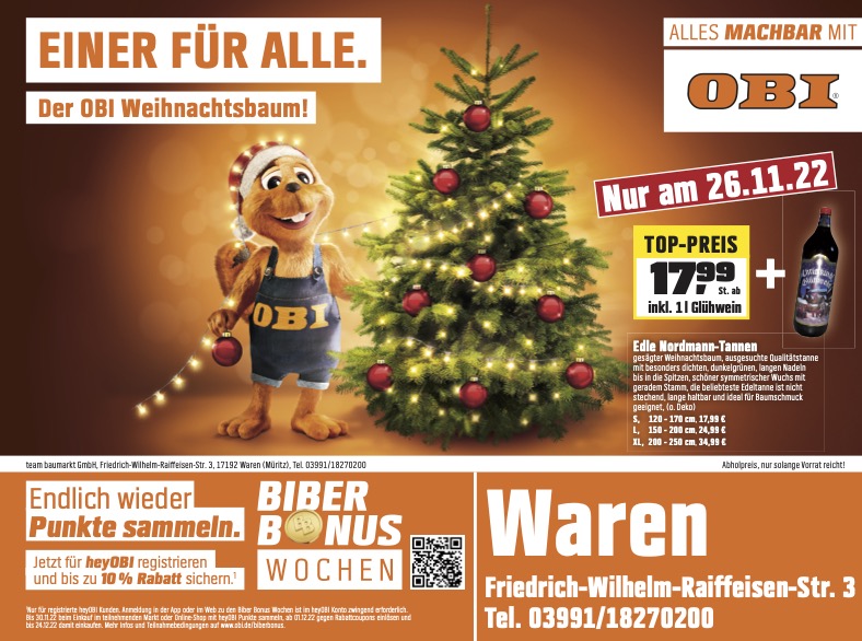 Die Zeit rennt, langsam kann man sich schon mal auf die Socken machen, und sich einen Weihnachtsbaum aussuchen. Im Warener OBI-Markt sind ab dem morgigen Sonnabend, 26. November, edle Nordmann-Tannen im Angebot – zu Top-Preisen und mit einem Extra. Denn für die Weihnachtsbaum-Käufer gibt’s NUR am Sonnabend einen Liter Glühwein gratis dazu. Außerdem können sich die Kunden des Marktes mit den Biber-Bonus-Wochen weitere Rabatte sichern.