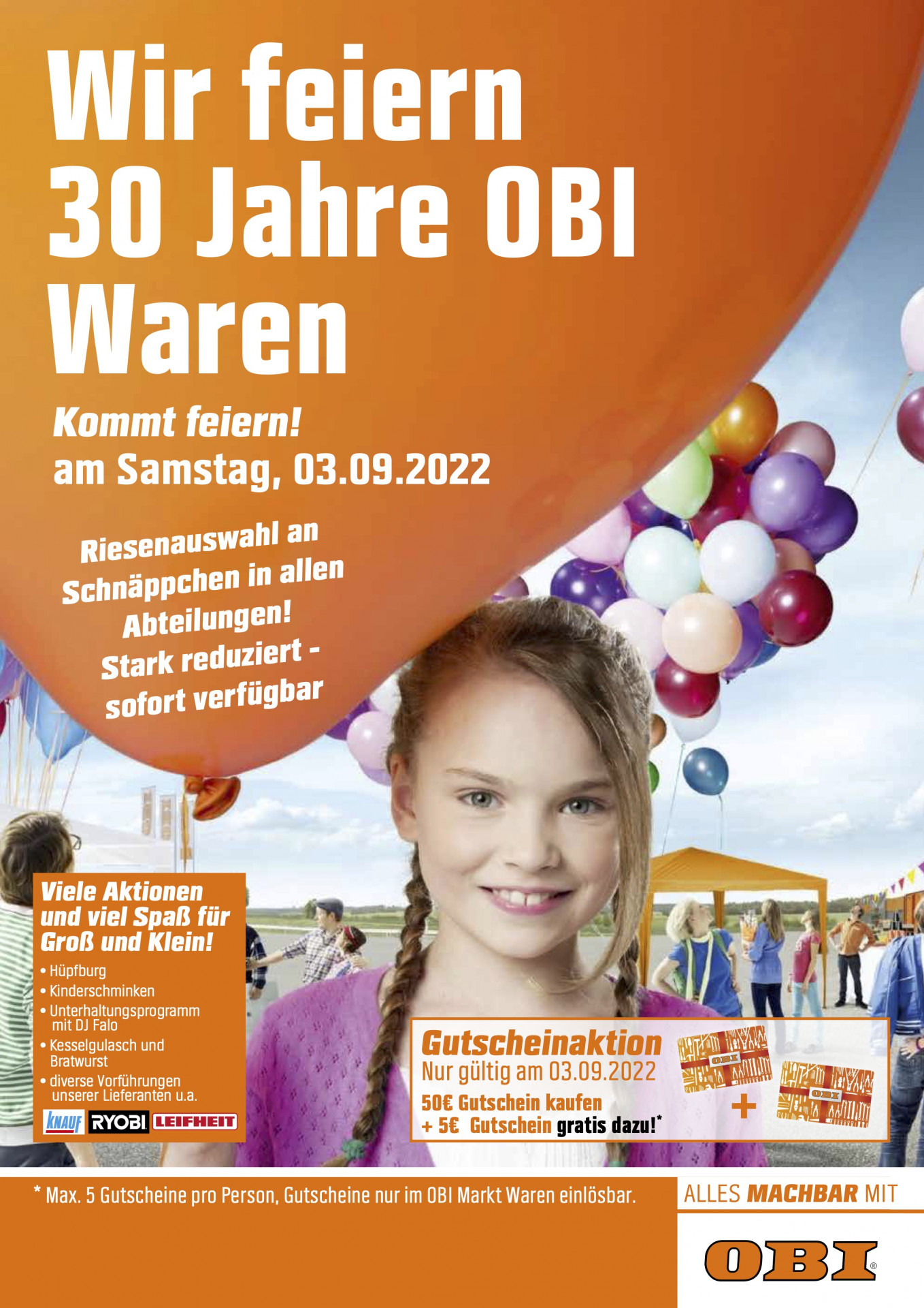 Der Warener OBI-Markt feiert Geburtstag – und zwar schon den 30. Das soll am kommenden Sonnabend, 3. September, natürlich gebührend gefeiert werden. Die Besucher können sich auf jede Menge Spiel und Spass, leckeres Essen und Schnäppchen in allen Abteilungen freuen. Außerdem gibt’s nur an diesem Tag eine Gutscheinaktion – Wer einen 50-Euro-Gutschein kauft, erhält einen 5-Euro-Gutschein gratis dazu.