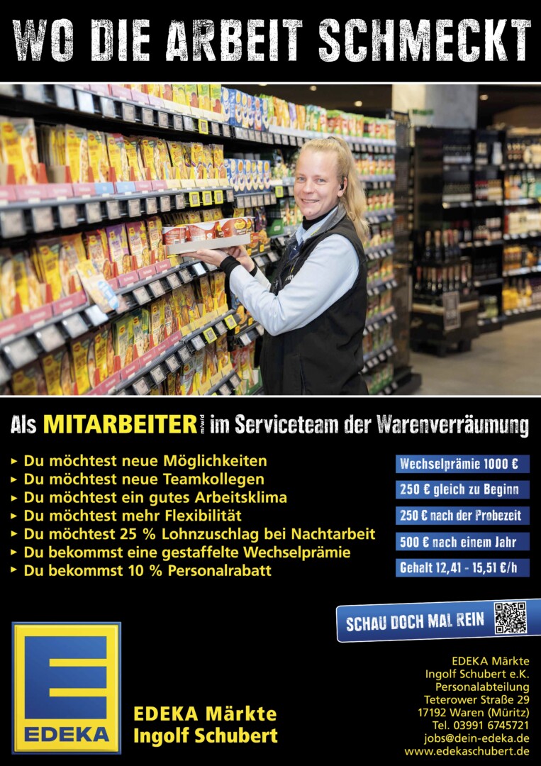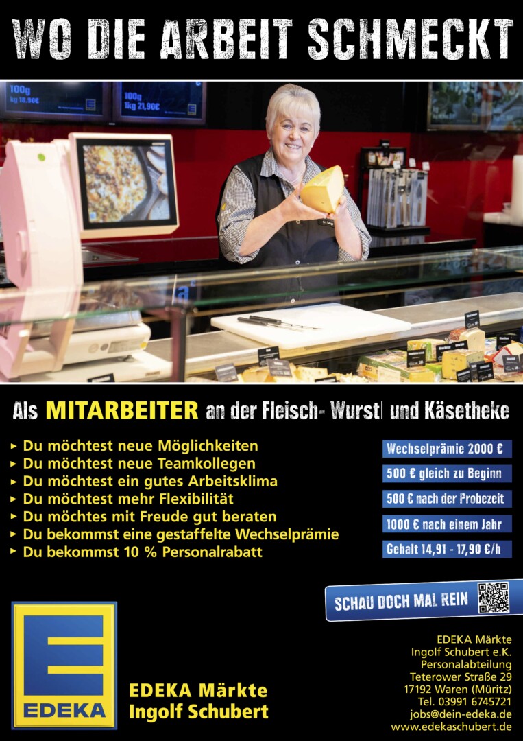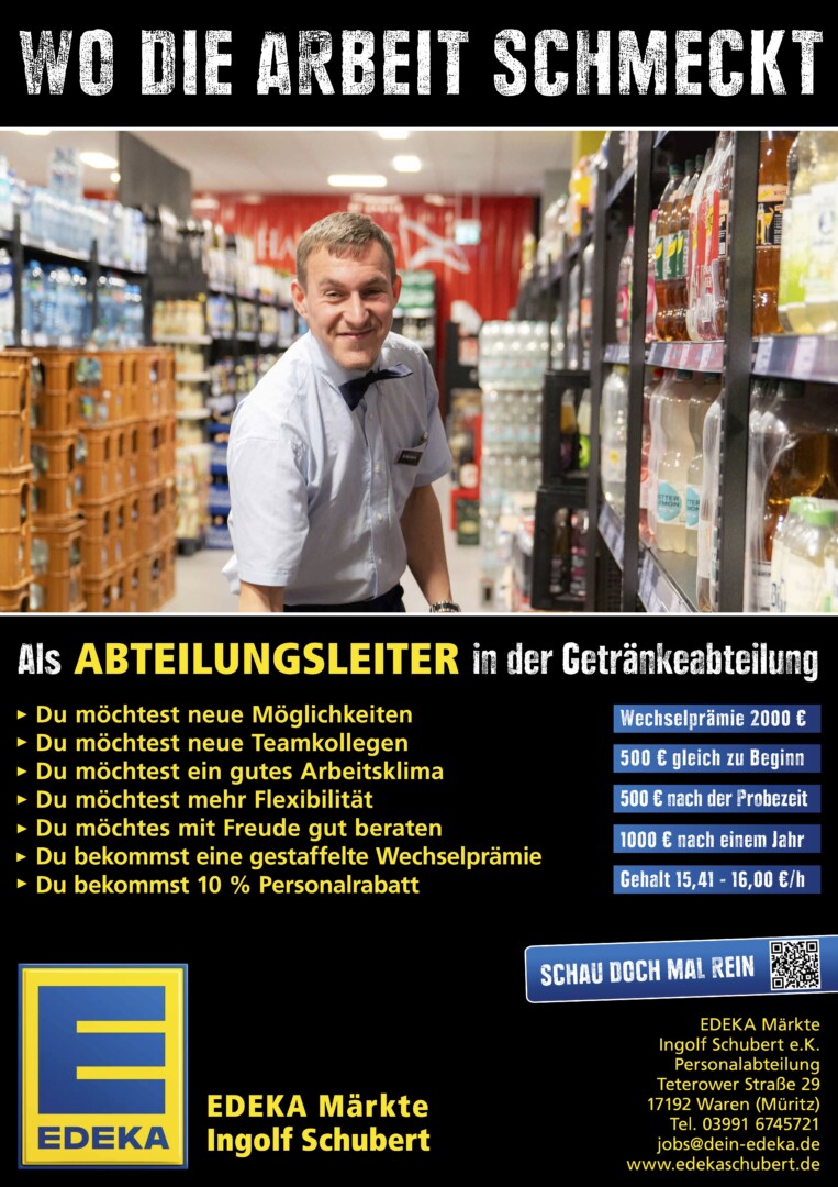 Wo die Arbeit schmeckt: Die EDEKA-Märkte Ingolf Schubert brauchen Verstärkung. Gesucht werden unter anderem ein Abteilungsleiter in der Getränkeabteilung sowie für die Fleisch-Wurst- und Käsetheke sowie Mitarbeiter im Serviceteam. Das Besondere: Auf die „Neuen“ wartet eine Wechselprämie.