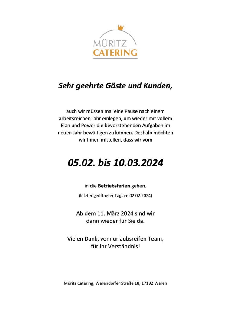 Die Bistro-Küche von Müritz-Catering im Warener ÜAZ hat geschlossen. Das Team um Riccardo Musolf macht Urlaub, und zwar bis zum 10. März. Dann gibt’s natürlich auch die aktuellen Speisepläne wieder bei „Wir sind Müritzer“.