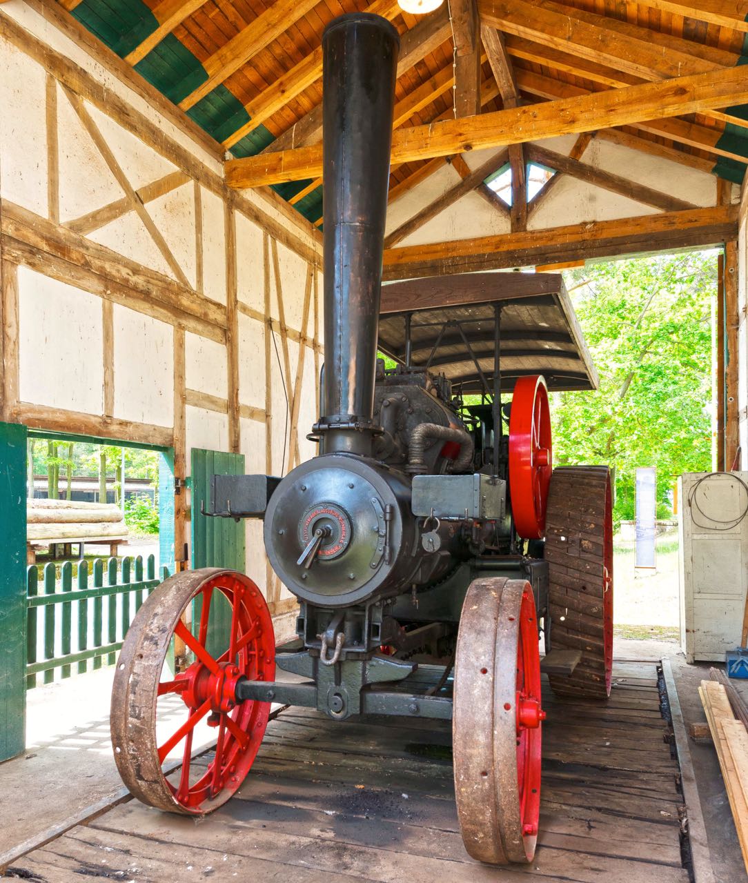 Zur Geschichte: Auf Geheiß der kaiserlichen Heeresleitung produzierten mehrere Firmen einen Dampftraktor (Straßendampflokomotive), die dann Kanonen des 1. Weltkrieges zu ihren Stellungen befördern sollten.