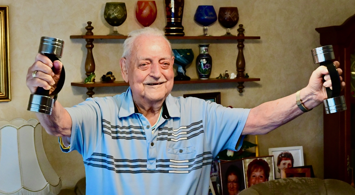 Zwar hat Siegfried Piarowski Hilfe von Bekannten, doch nach dem Tod seiner Frau Hanni vor etwa sieben Jahren lebt er alleine in seiner gemütlich eingerichteten Wohnung Am Rosengarten. Er kocht, backt, wäscht und hält den Haushalt in Ordnung. Außerdem gehört nach wie vor Sport zu seinem Alltag. Das beweist er dem Bürgermeister dann gleich mal auf dem Balkon mit ein paar Liegestützen am Geländer. Hanteln und diverse kleinere Sportgeräte finden sich in seiner Wohnung und werden täglich genutzt. „Das muss sein“, sagt der Senior. Schließlich gehörte Sport auch früher zu seinem Leben, unter anderem war er Turner.