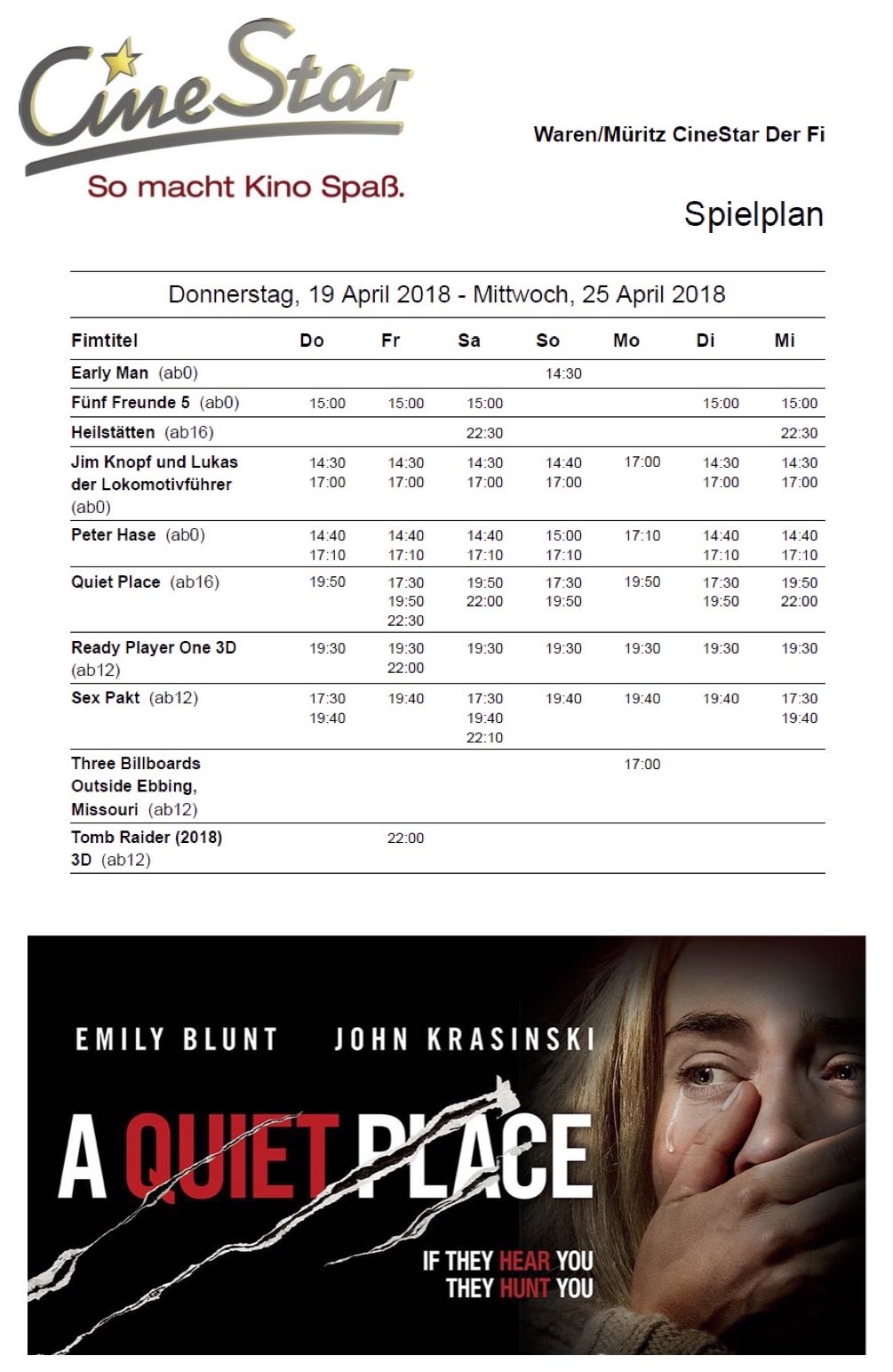 Auf Wunsch zahlreicher Leser veröffentlicht „Wir sind Müritzer“ in Zusammenarbeit mit Kinoleiter Max Knaack ab sofort regelmäßig das Kinoprogramm des CineStar Waren: