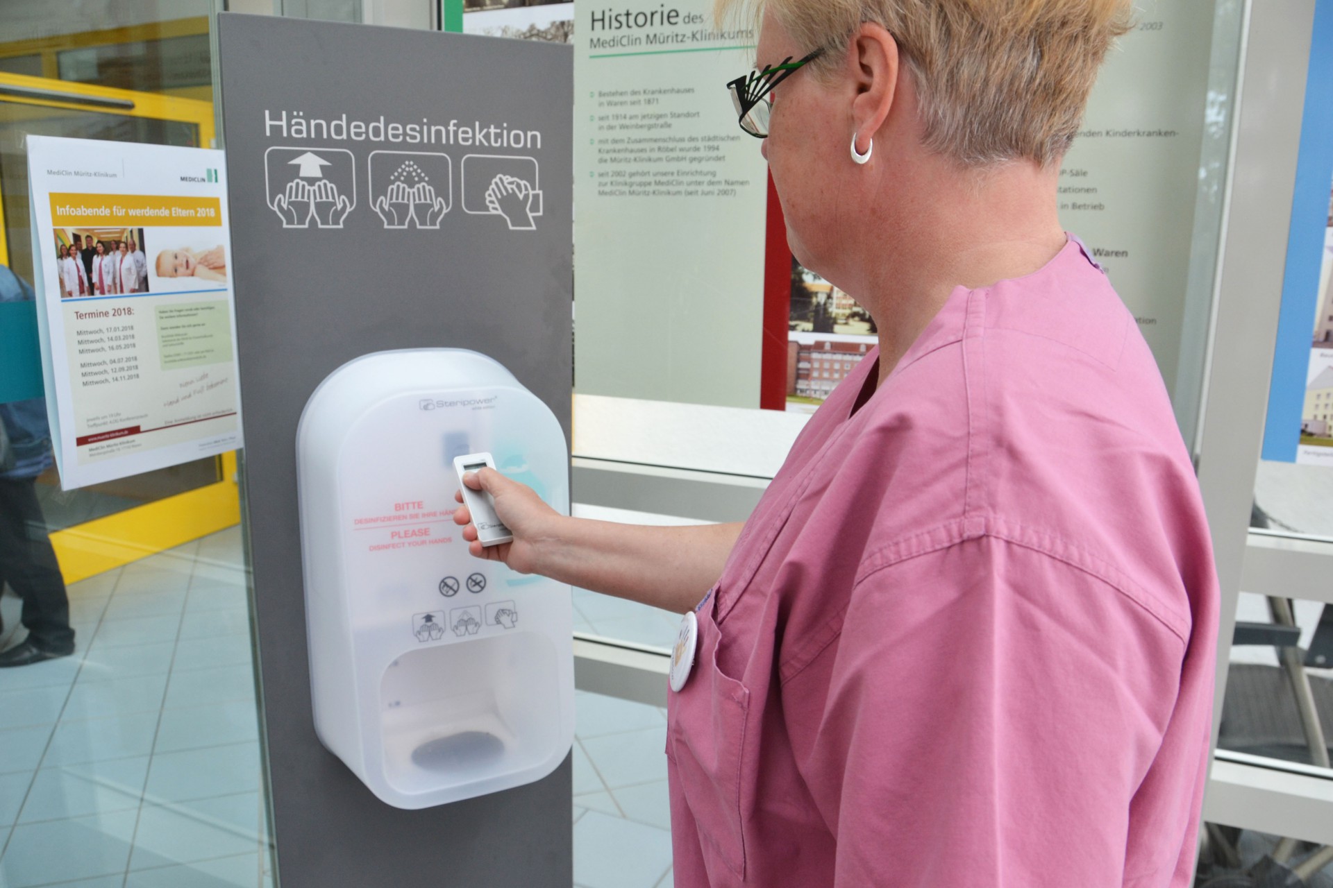 Das weiß die leitende Hygienefachkraft der Warener MediClin so genau, weil sie mittels eines kleinen Handsenders ganz einfach die Anzahl der Sprühstöße, die das Gerät bereits abgegeben hat, auslesen kann. Pro Sprühstoß werden 1,5 ml des Desinfektionsmittels freigesetzt – diese Menge reicht aus, um sich beide Hände zu desinfizieren. „Das Desinfektionsmittel, welches in die trockenen Handinnenflächen gesprüht wird, sollte anschließend im Rahmen der Einwirkzeit ca. 30 Sekunden lang auf den Handinnenflächen und den Handrücken verrieben werden. Beim Verreiben sollten auch die Fingerzwischenräume, Daumen, Nagelfalz und Fingerkuppen besonders beachtet werden.“, erklärt Antje Zädow. Die Anwendung beim Betreten und Verlassen des MediClin Müritz-Klinikums reduziert die Verschleppung von Keimen.