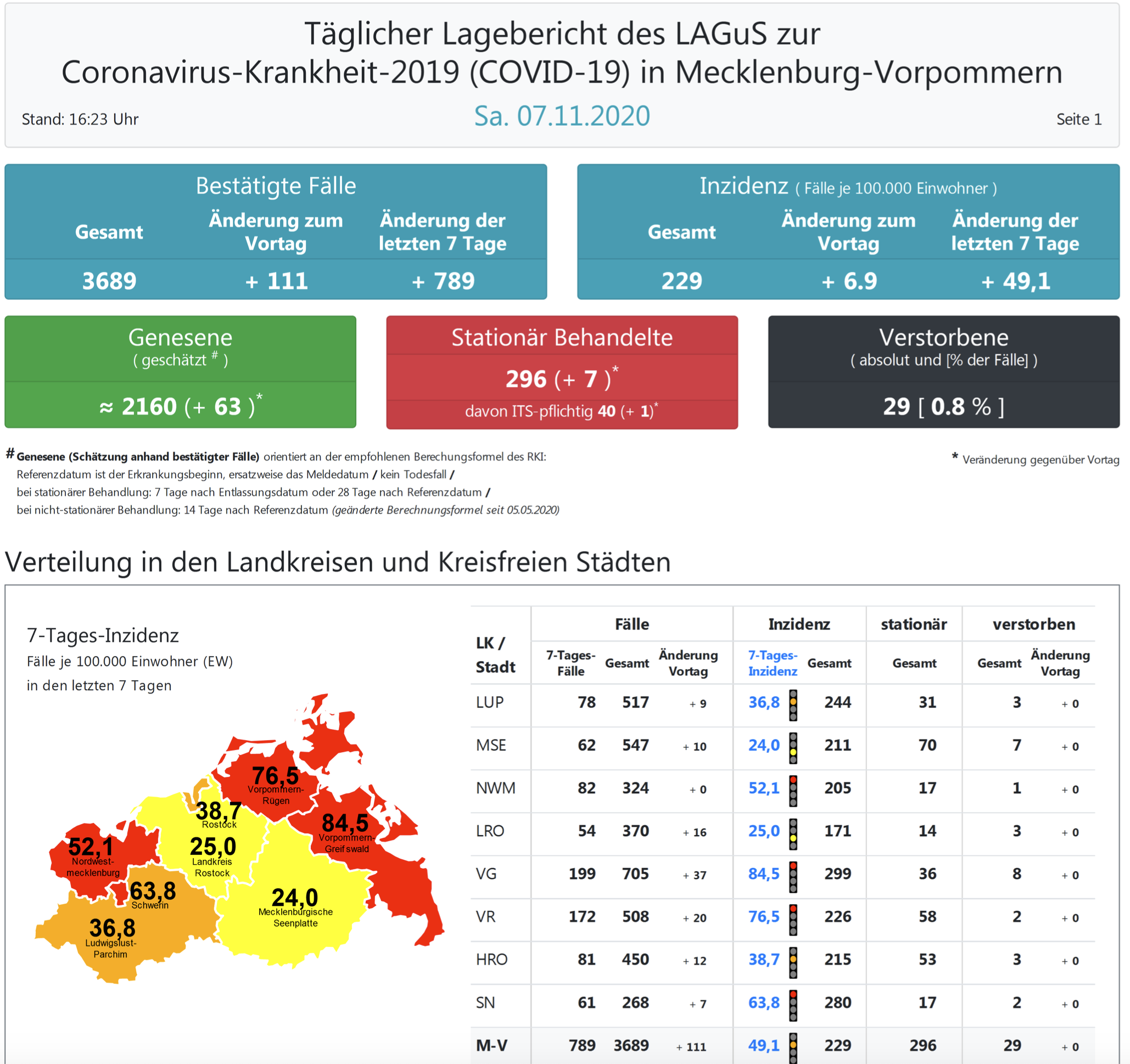 Landesweit müssen oder mussten den Angaben zufolge 296 Menschen in Kliniken behandelt werden, 40 von ihnen auf Intensivstationen.