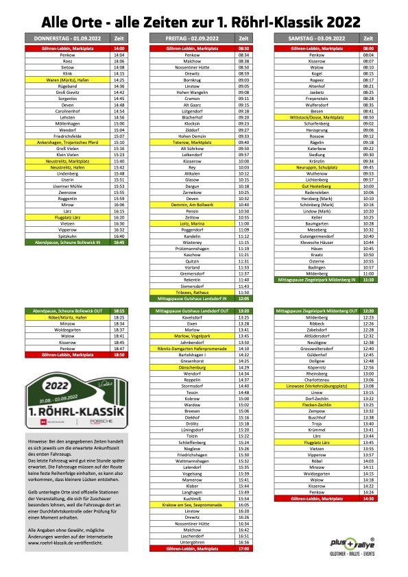 Premierenstart der Röhrl-Klassik auf dem Marktplatz in Göhren-Lebbin ist der 1. September, 14 Uhr. Gleich am ersten Fahrtag stehen echte Highlights auf dem Programm, darunter auch sechs Wertungsprüfungen und sechs Durchfahrtskontrollen. Erste Station ist Waren an der Müritz. Es geht zum Hafen, vorbei an den vielen Cafés mit besten Blick auf die Müritz. Über einsame Landstraßen führt die Route auch in einen Ort mit einem ganz besonderen Namen: Sorgenlos. Weiter geht es nach Ankershagen, dem Ort, an dem der weltberühmte Altertumsforscher, Archäologe und Troja-Entdecker Heinrich Schliemann seine Jugendjahre verbracht hat. Ihm zu Ehren steht hier auch eine riesiges begehbares Trojanisches Pferd. Durch den Müritz-Nationalpark geht es nach Neustrelitz. Die sternförmige spätbarocke Stadtanlage dieser Residenzstadt ist europaweit einmalig. Teilnehmer können sich sicher sein, dass auf dem Marktplatz oder auch bei der darauffolgenden Prüfung am Hafen von Neustrelitz viele Besucher sein werden.
