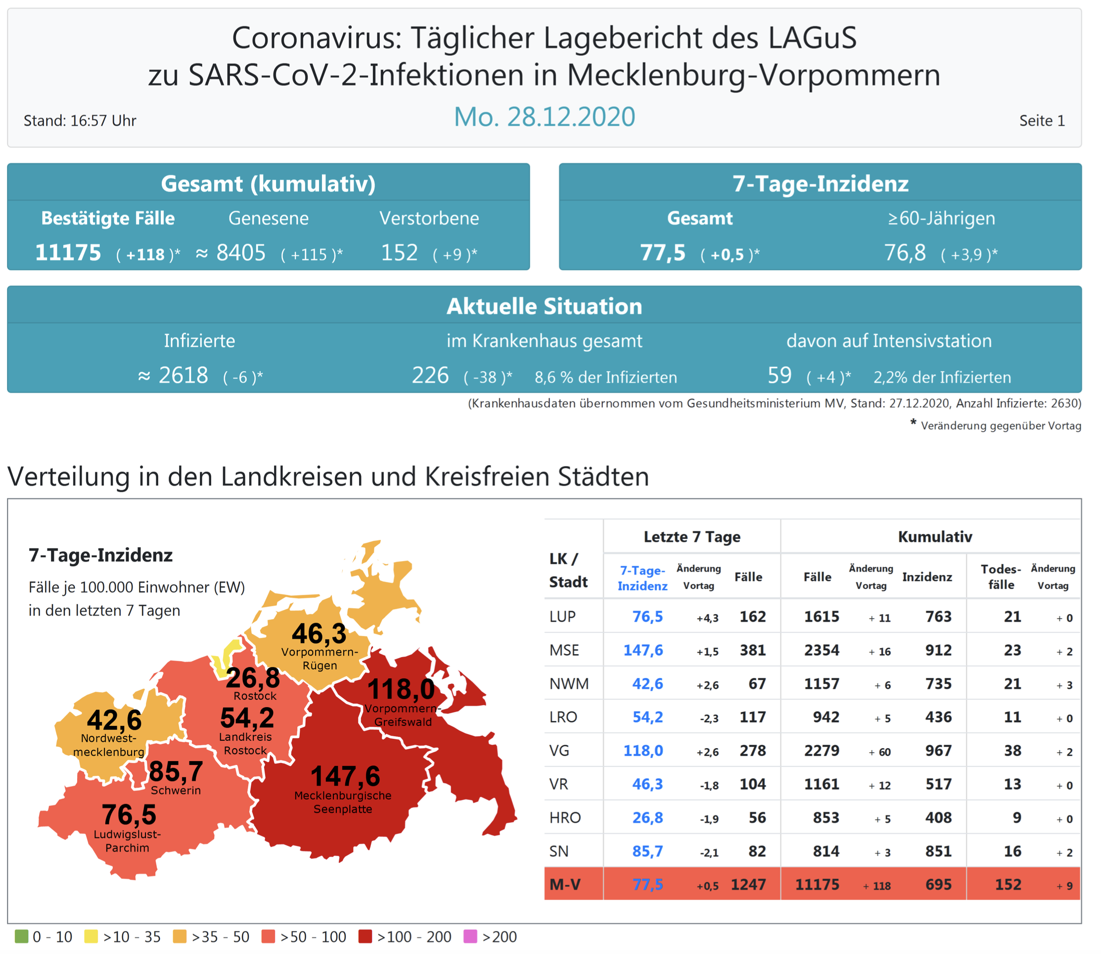 Insgesamt wurden in Mecklenburg-Vorpommern bisher 11175 Infektionen festgestellt. Im Land gab es bislang 152 Todesfälle, neun mehr als gestern, der Landkreis Mecklenburgische Seenplatte meldet zwei neue Todesfälle.