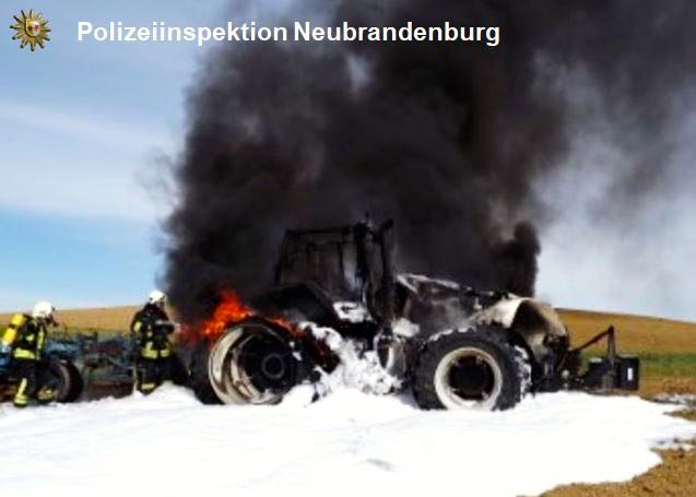 Auf einem Feld zwischen Remplin und Retzow ist heute Vormittag ein Traktor in Flammen aufgegangen. Die eigenen Löschversuche des 54-jährigen Fahrers schlugen fehl, so dass das Fahrzeug komplett ausbrannte.