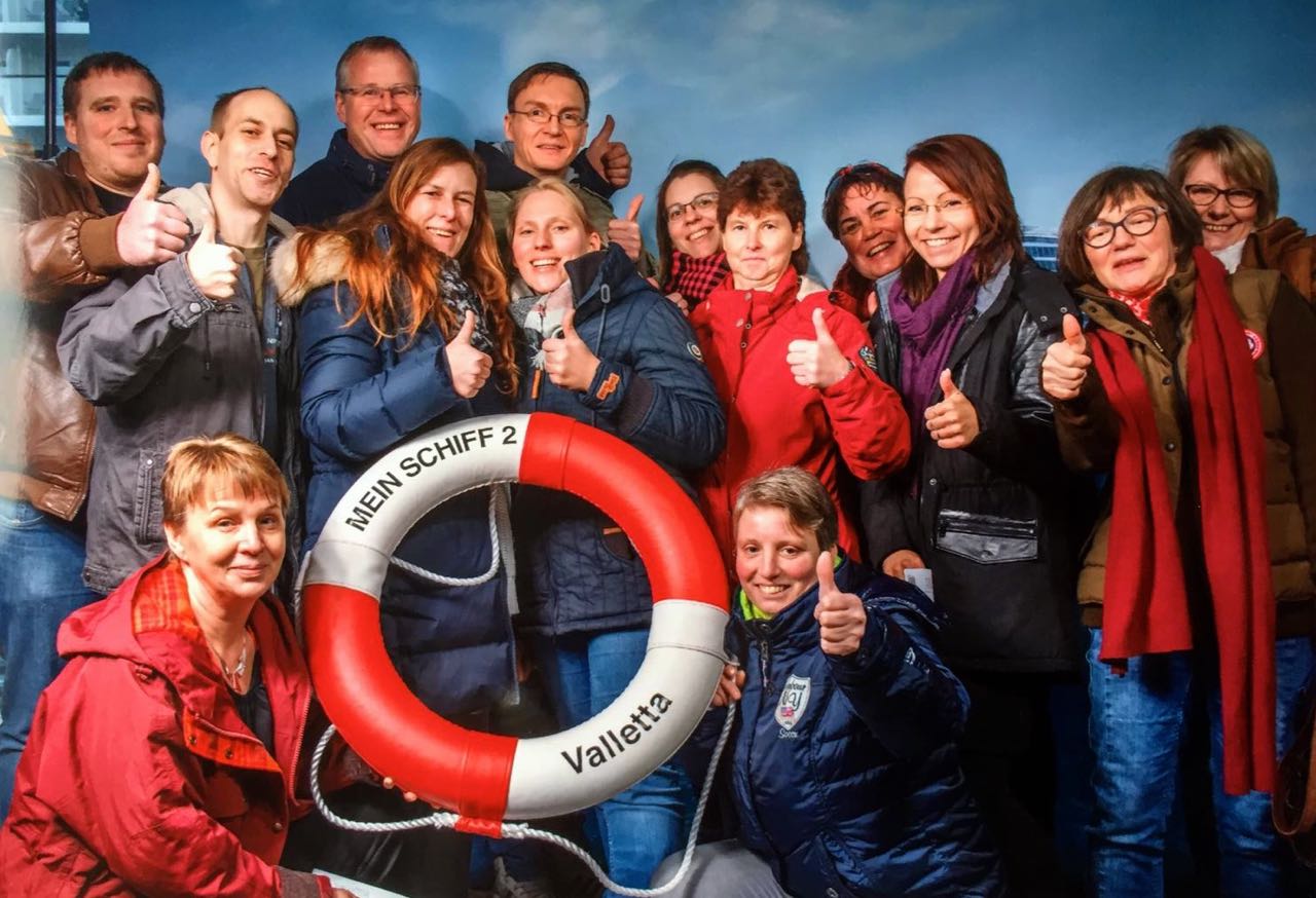 In sieben Balkonkabinen auf einem nigelnagelneuen „Pott“, der neuen „Mein Schiff 2“, genoss die gesamte Belegschaft gemeinsam mit ihren beiden Chefs eine sechstägige Luxuskreuzfahrt der sprichwörtlichen Extraklasse.