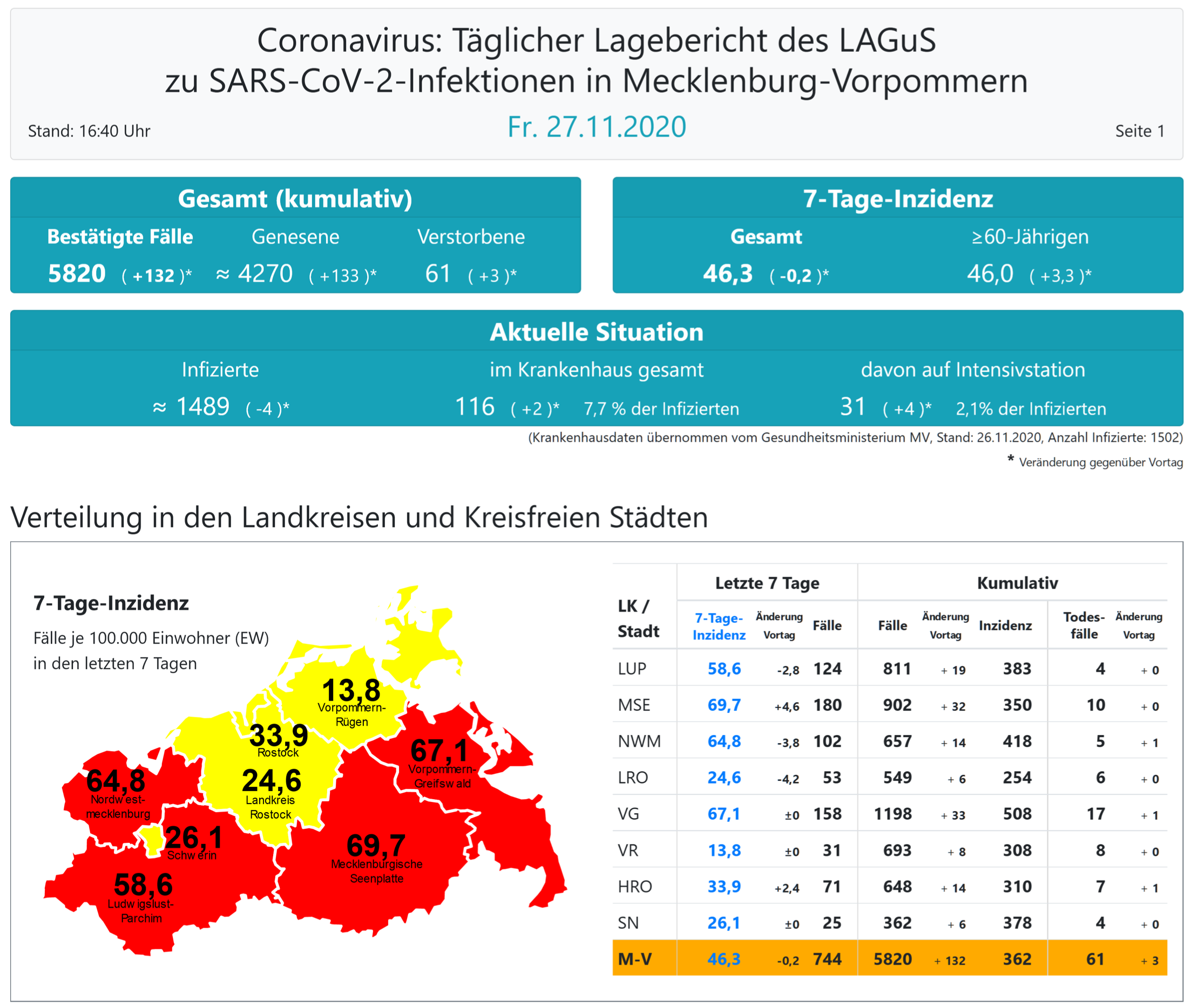 Insgesamt wurden in MV bisher 5820 Infektionen festgestellt. Laut einer Schätzung des Robert Koch-Instituts (RKI) sind in Mecklenburg-Vorpommern 4270 der positiv getesteten Menschen von einer Covid-19-Erkrankung genesen. Insgesamt gab es bislang 61 Todesfälle im Land.