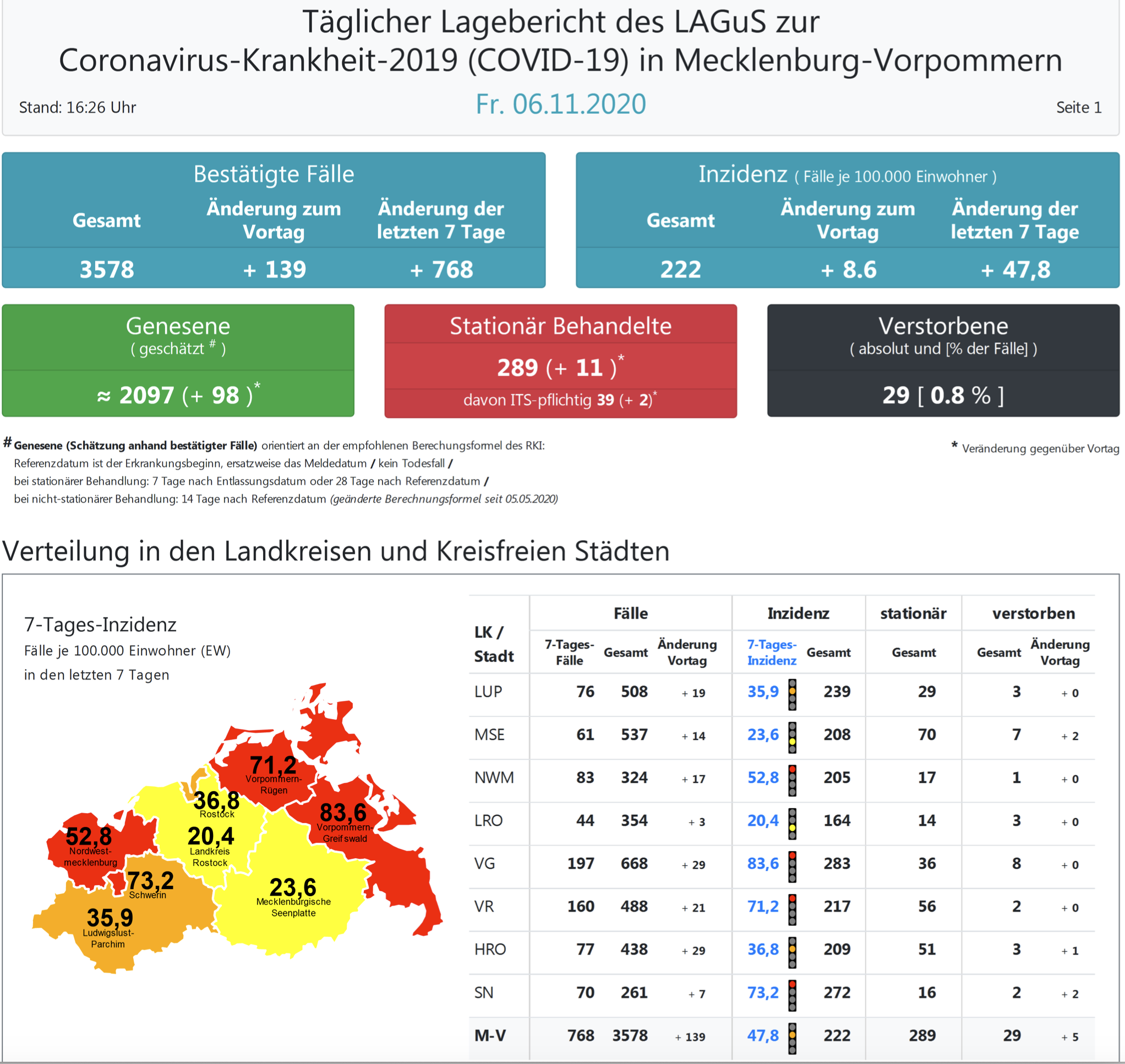 Landesweit müssen oder mussten den Angaben zufolge 289 Menschen in Kliniken behandelt werden, 39 von ihnen auf Intensivstationen.