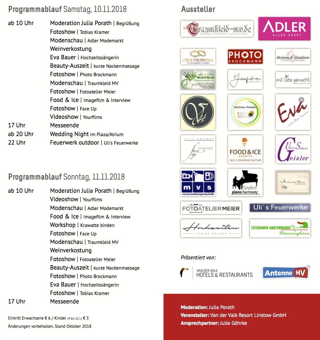 Bereits zum 15. Mal veranstaltet das Van der Valk Resort in Linstow am kommenden Wochenende, also am 10. und am 11. November, eine große Hochzeits- und Festtagsmesse. Jeweils von 10 bis 17 Uhr gibt es im Valkensaal ein ganztägiges Bühnenprogramm, Modenschauen, Livemusik und mehr.