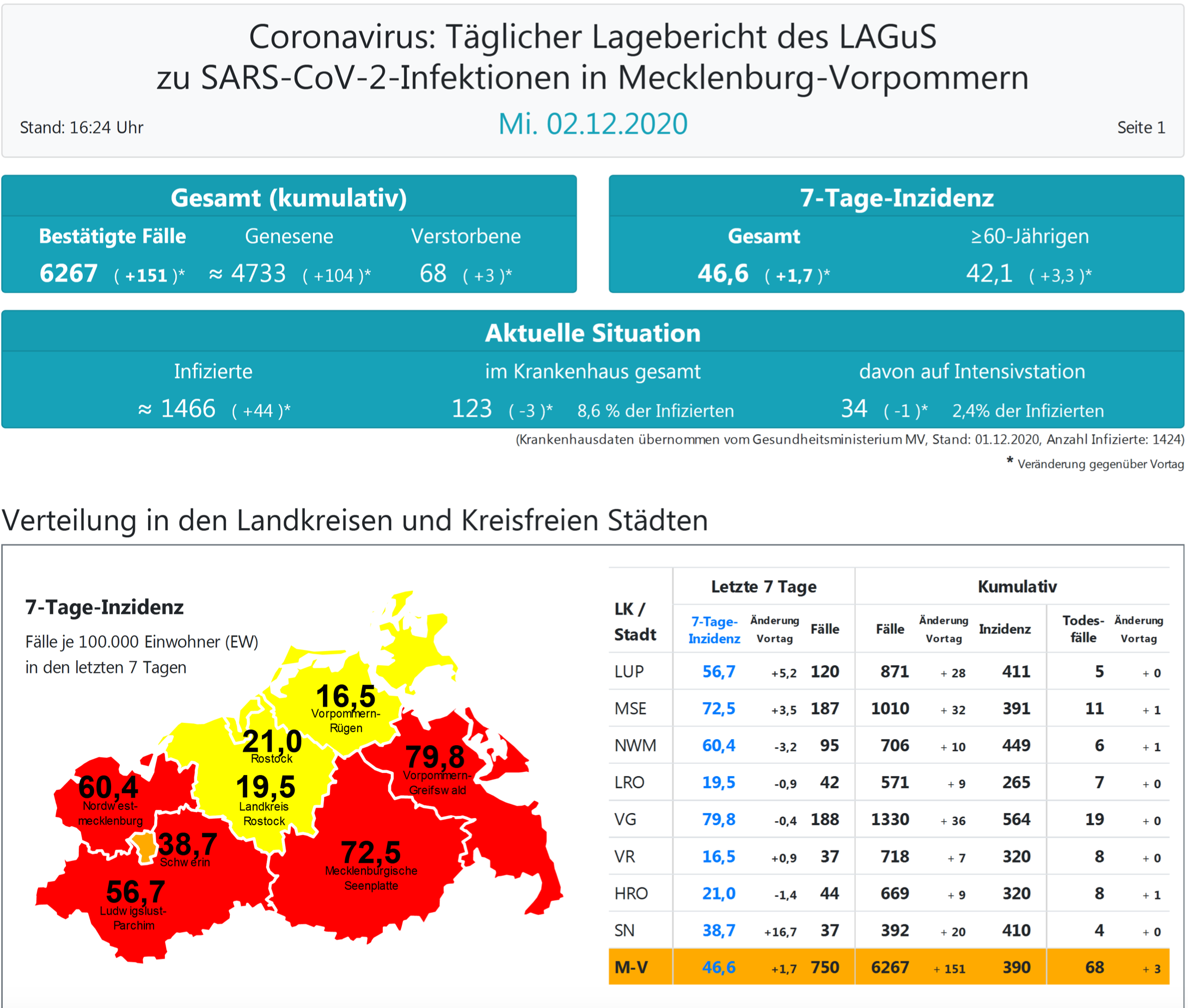 Insgesamt wurden in MV bisher 6267 Infektionen festgestellt. Laut einer Schätzung des Robert Koch-Instituts (RKI) sind in Mecklenburg-Vorpommern 4733 der positiv getesteten Menschen von einer Covid-19-Erkrankung genesen. Insgesamt gab es bislang 68 Todesfälle im Land, drei mehr als gestern.