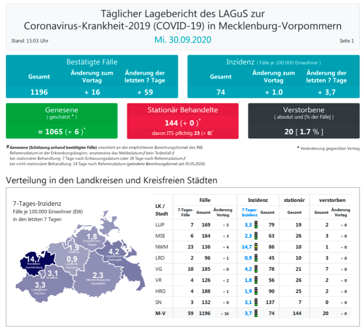 Laut einer Schätzung des Robert Koch-Instituts (RKI) sind in Mecklenburg-Vorpommern 1065 der positiv getesteten Menschen von einer Covid-19-Erkrankung genesen. Insgesamt gab es bislang 20 Todesfälle im Land.