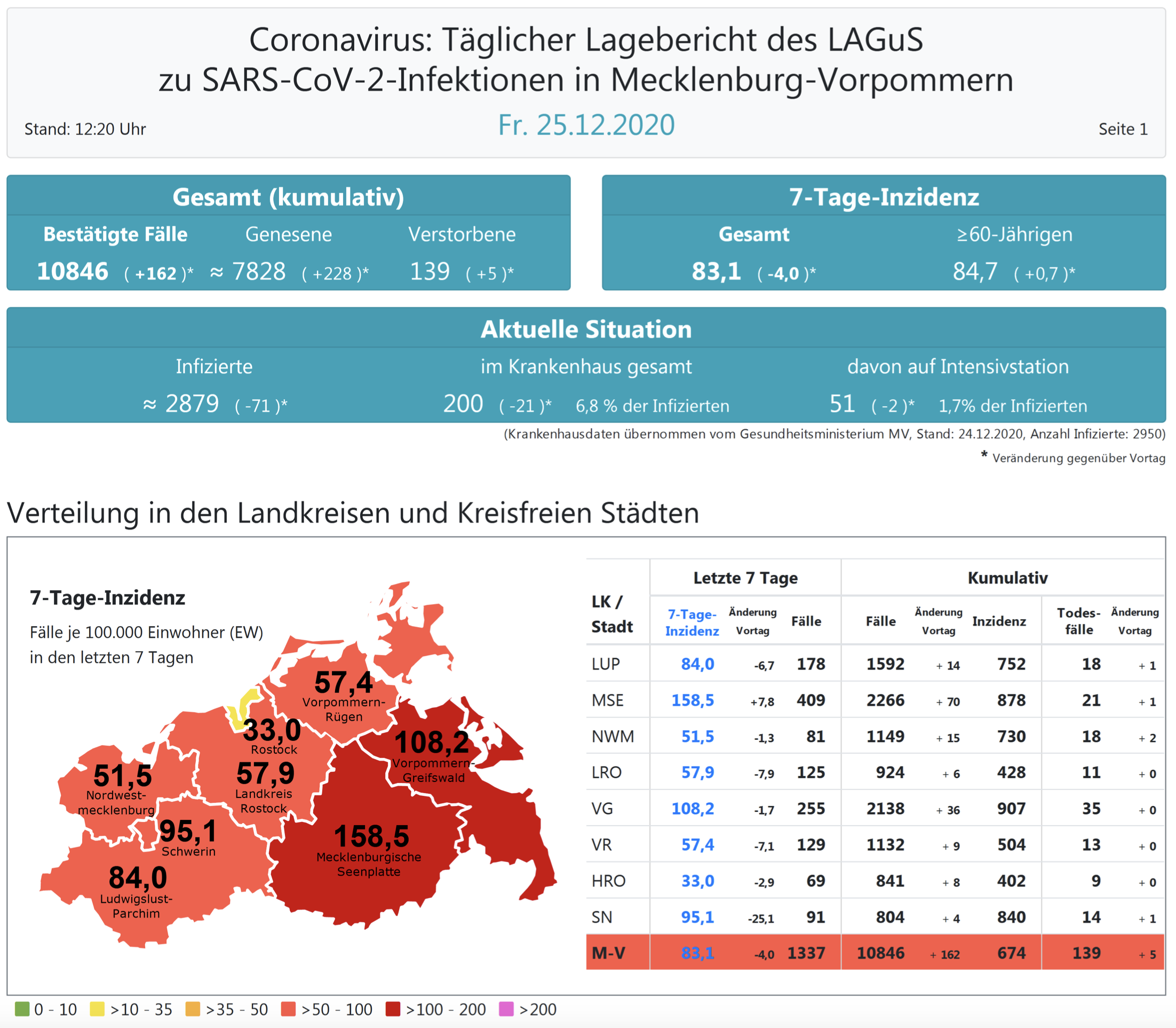 Insgesamt wurden in Mecklenburg-Vorpommern bisher 10 846 Infektionen festgestellt. Im Land gab es bislang 139 Todesfälle, fünf mehr als gestern. Der Landkreis Mecklenburgische Seenplatte melden einen neuen Todesfall.